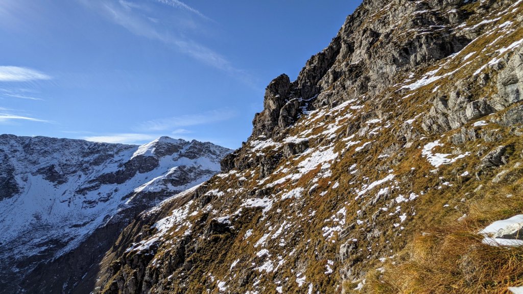 Kurz vor der Scharte zwischen Kleinem Daumen und Auf dem Falken. Hier hatte es massiv Schnee (<50 cm)